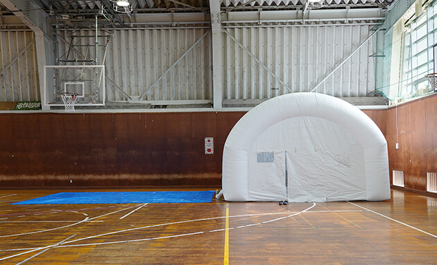HEPAフィルターが病原体を捕集、室内の空気を外に漏らさないよう気圧を低くした『陰圧仕様』。避難所内に体調不良者を隔離した空間を設けて感染症対策に。